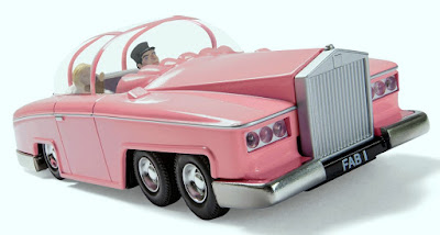 It's interesting to note that, unlike its 2005 release, this latest edition of FAB 1 doesn't have the ROLLS ROYCE radiator ornament The SPIRIT Of ECSTASY, making it (in my eyes) less collectable than the earlier version. I wonder if RR refused permission, or whether Corgi would've had to pay for the privilege and decided not to in order to keep costs down. Or maybe it was just too delicate and kept breaking off - anyone know?