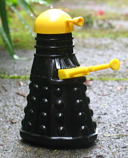 Being an honest man (contrary to the scurrilous insinuations of some), I told him that it might be worth a few quid and that perhaps he should hang onto it, JP, but he wasn't bothered as he knows I'd never sell it anyway. He also got me a Dapol reissue of a Marx friction-drive Dalek, and the two of them are currently sitting side-by-side on my sideboard (which is rather apt when you think about it).