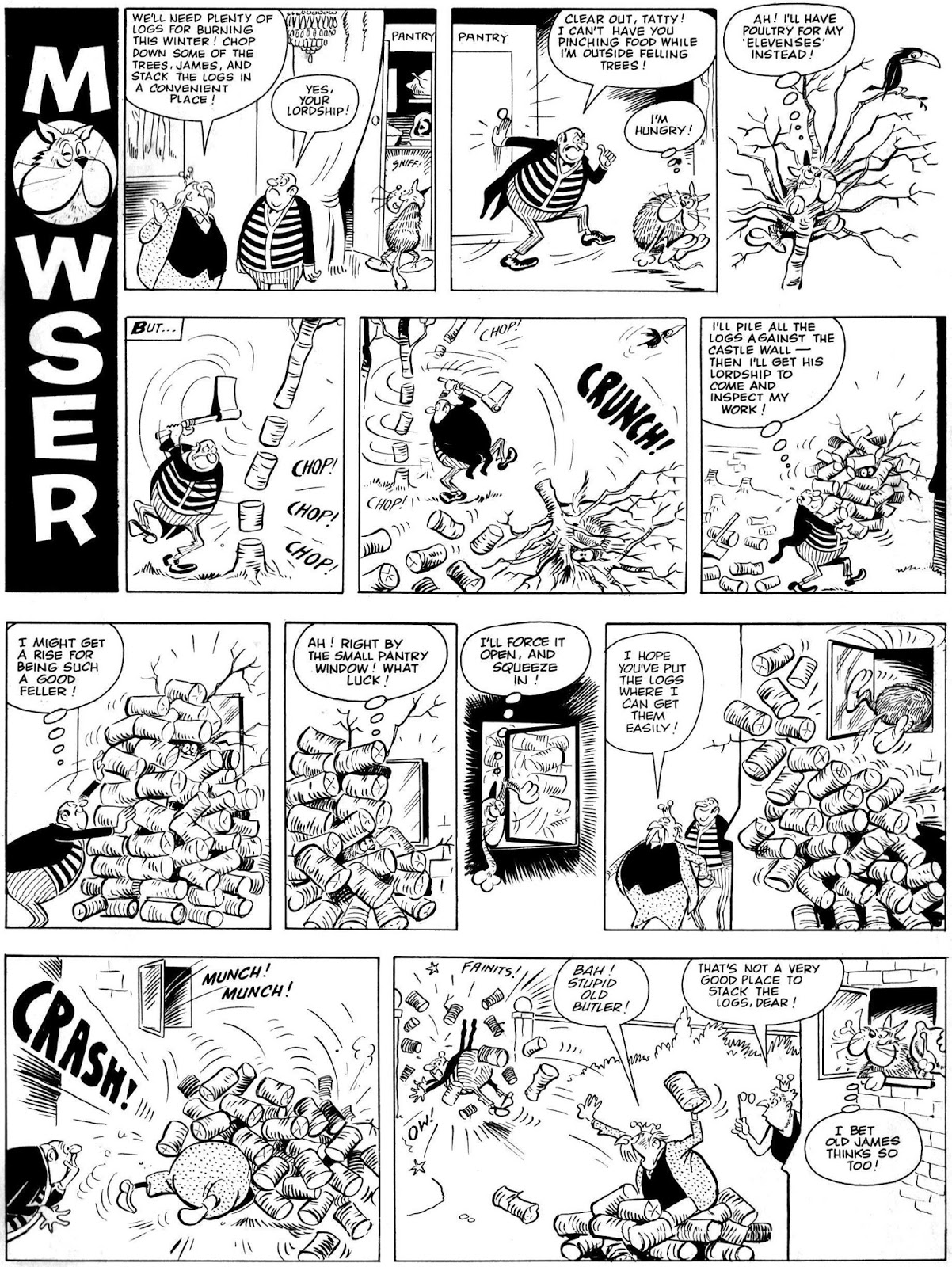 Here's another page of MOWSER for all fans of REG PARLETT and, of course, 'The Priceless Puss' himself. This is a reprint that appeared in the 1976 LION Holiday Special, hence the bigger horizontal gutters between each tier to accommodate the different page dimensions. Upon examination, I see that the panels have also been 'resized', but curiously not to the extent of maintaining the original gutter space. Still funny though.