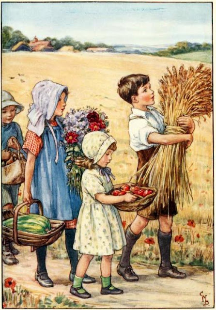 So what's the point of all this philosophical rambling? Merely this: I wanted to explain the reasons why I now unleash upon you the twelve colour illustrations by Cicely Mary Barker from The Little Picture Hymn Book. Looking at them, don't you feel like a little kid again, playing under the hot Summer sun in the grassy green fields of your childhood when you thought you'd be a child forever?